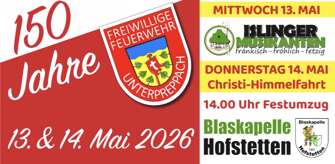 Home Termine 150 Jahre Freiwillige Feuerwehr Unterpreppach 13.05.2026 18:00 bis 14.05.2026 21:00 Feuerwehrfest Inspektion I 150 Jahre FF Unterpreppach Unterpreppach.jpg Zu Kalender hinzufügen